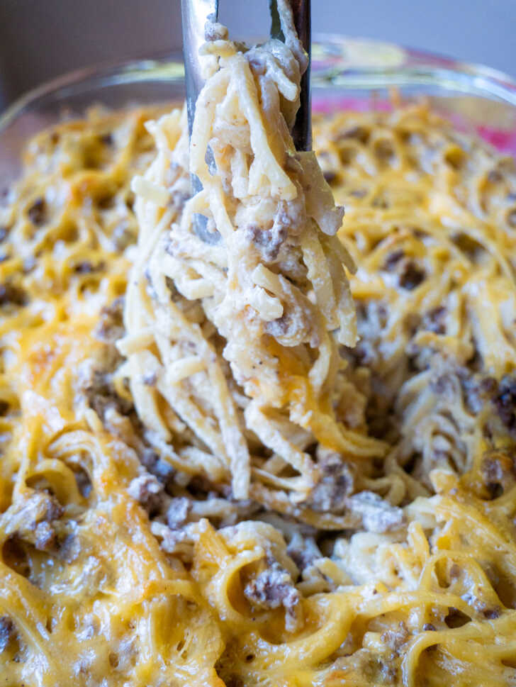 The sauce is seasoned with mustard powder and Worcestershire, which gives it more of a hearty flavor. Stir that beef back in along with half of the cheese and toss it with the pasta. Get it into a 9×13, top it with more cheese, and all that’s left to bake! And enjoy, of course, but that’s even easier to do than making it.