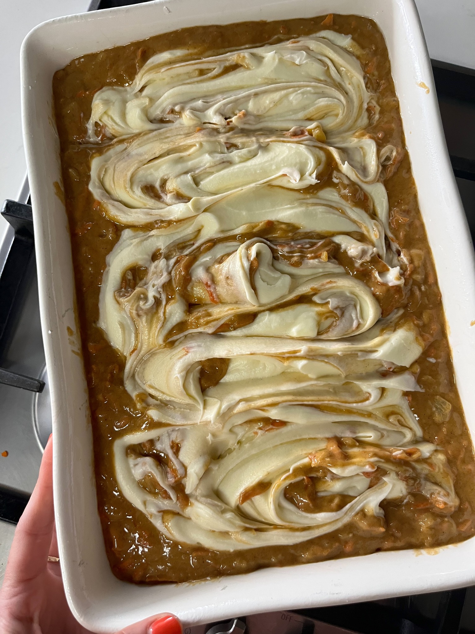 The cream cheese mixture is what really makes this cake special. Cream cheese, butter, powdered sugar, and vanilla are blended until smooth, then scooped right over the top of the batter. A few gentle swirls with a knife is all it takes. As it bakes, the cream cheese sinks and spreads, creating creamy pockets throughout the cake and giving it that beautiful cracked, earthquake look on top.