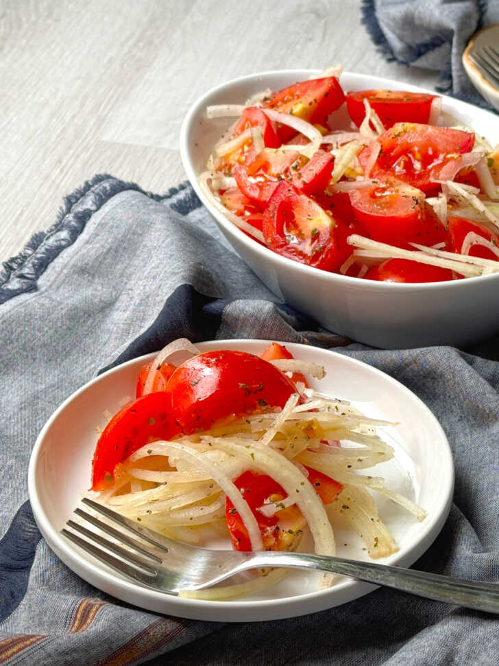 Tomato and Onion Salad is one of those salads that seems too good to be true. A short list of ingredients pair up with an even shorter list of ingredients for a dressing, creating a salad you’ll want to make throughout the tomato season