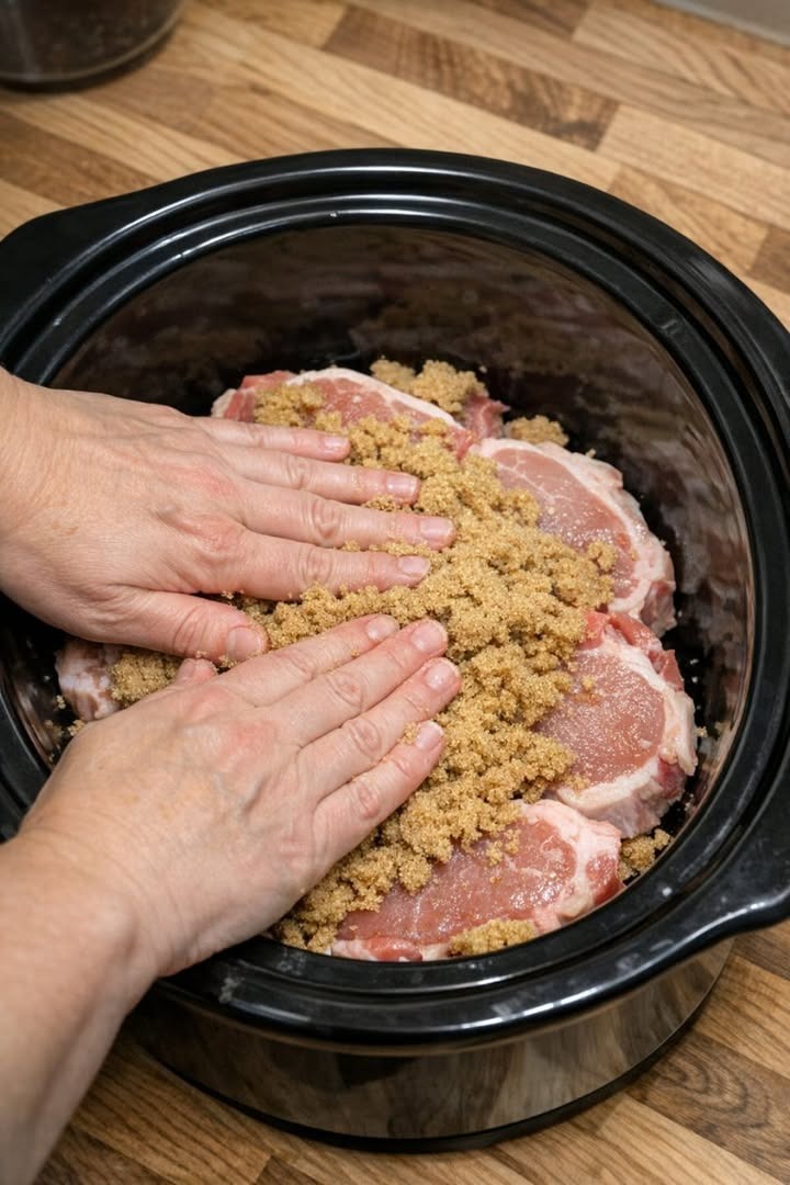 💡 Pro Tips:Pat pork chops dry before adding to help the sugar adhere.Press brown sugar firmly onto both sides of each chop—it creates a caramelized crust as it melts.Do not stir after layering—this keeps the glaze intact.
