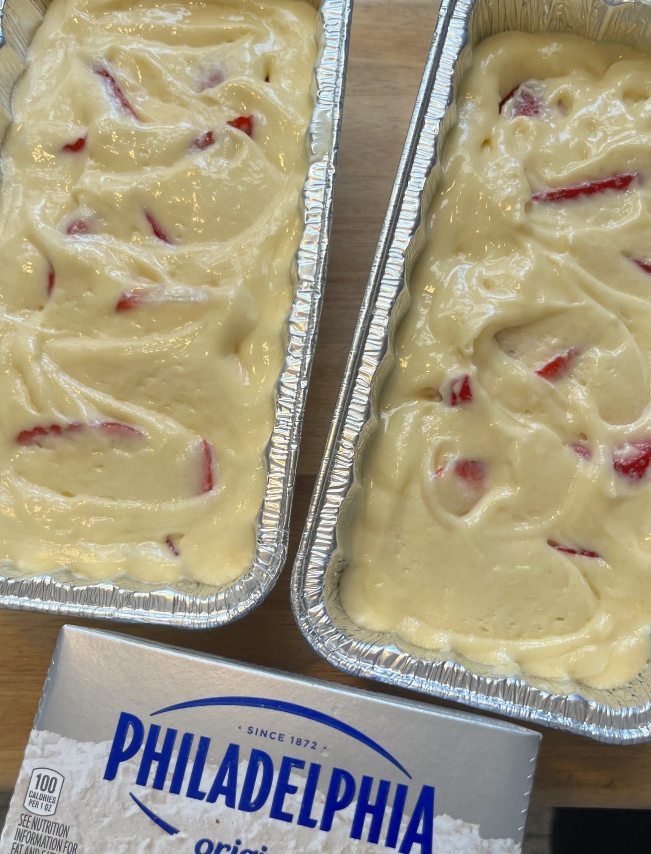 The batter starts out with an indulgent stick of butter and a full package of cream cheese. The creamy tang of the cream cheese really bumps up the flavor and creates a texture so tender it practically melts in your mouth (yum!). From there you’ll add in some regular pantry staples, two eggs, and a cup of milk. The final ingredient: the fresh strawberries! Make sure to dab the berries to remove excess moisture so they don’t sink or make the loaf soggy—the small step makes a big difference