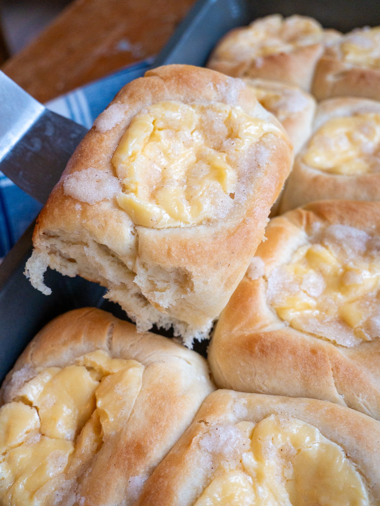 A kolache is a Czech pastry, right? It is. But Texas, believe it or not, has become known for them too. The Lonestar State has a style of making them that’s all their own and they can be found in bakeries and roadside stands across the state. Like the saying goes, everything is bigger in Texas, and that’s true of their Kolaches too. The Texas Kolache tradition originated with Czech immigrants who settled in central Texas, and over the years the Texas Kolache has become a taller, fluffier pastry than the original. You can stuff them with preserves, jam, even sausage, but here they’re filled simply with a silky cream cheese mixture that’s hard to resist.
