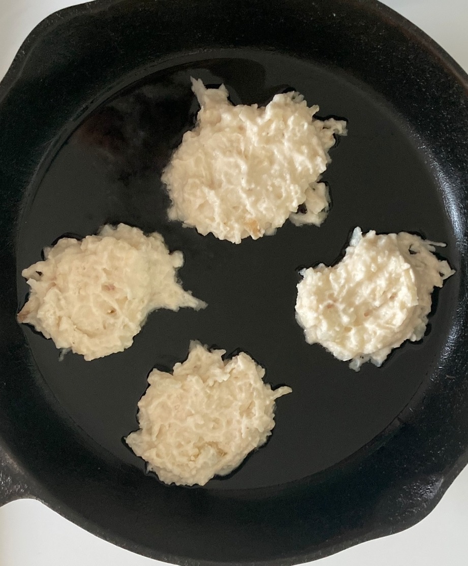 To make the mashed potatoes you don’t need to add milk or butter or anything. But, they don need to be chilled completely before adding the other ingredients. Basically you boil and mash 2 potatoes and then grate 1 potato.