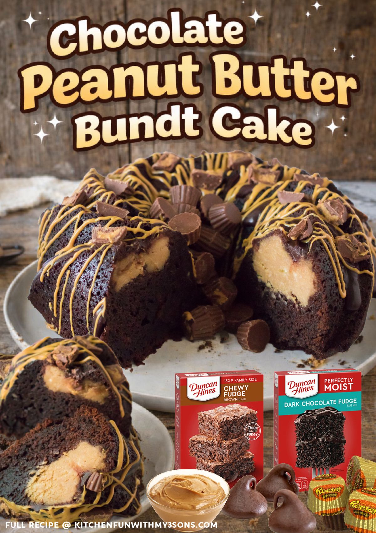 This Chocolate Peanut Butter Bundt Cake is a rich chocolate/brownie cake batter with a peanut butter cheesecake filling, topped with a peanut butter glaze and Reese's peanut butter cups.