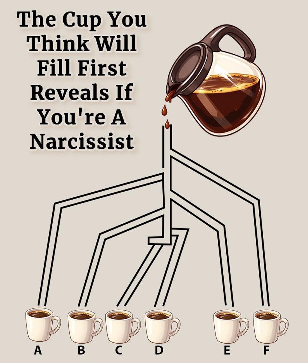 At first, this image looks like a simple logic puzzle. Coffee flows through a network of pipes toward six cups labeled A through F. The challenge seems easy: which cup will fill first?