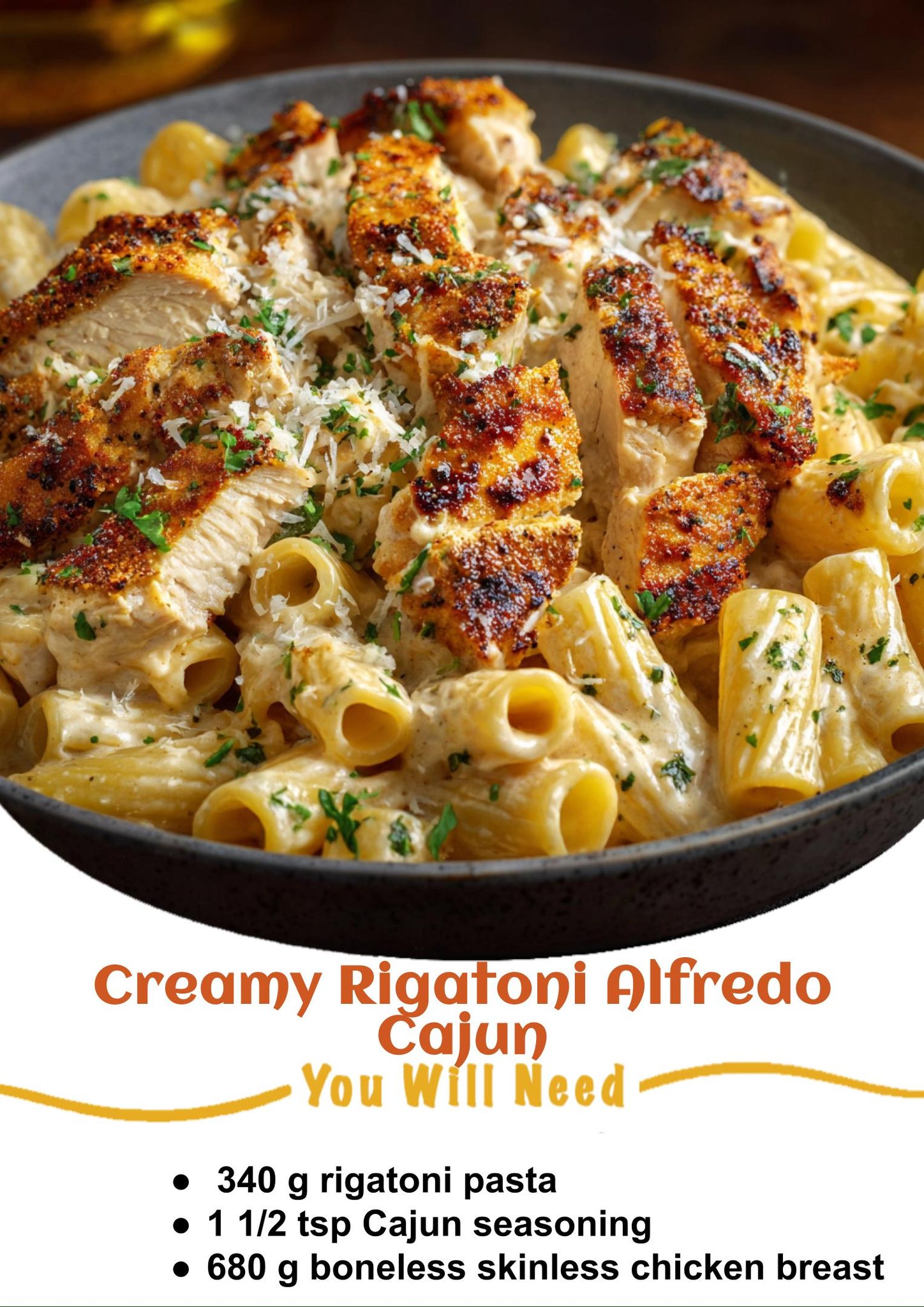 This dish features rigatoni pasta dressed in a luxuriously smooth Alfredo sauce enriched with Velveeta, Parmesan, mozzarella, and cream cheese. Cajun-spiced chicken breast, seared until golden, adds a bold and zesty note. A touch of Italian seasoning and fresh garlic deliver aromatic depth, while chopped parsley provides a fresh finish. Each bite blends velvety sauce, perfectly cooked chicken, and chewy pasta, promising rich flavors with a gentle Cajun kick—perfect for a comforting meal everyone will love.