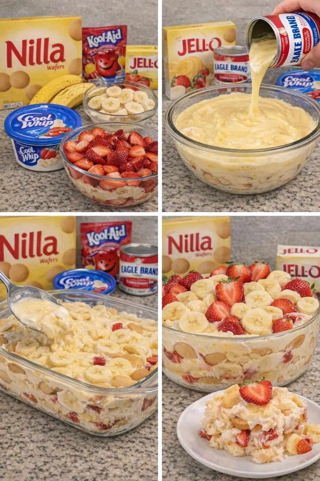 Pour the mixture over the cookies and bananas add chopped strawberries and cover with the remaining cookies.