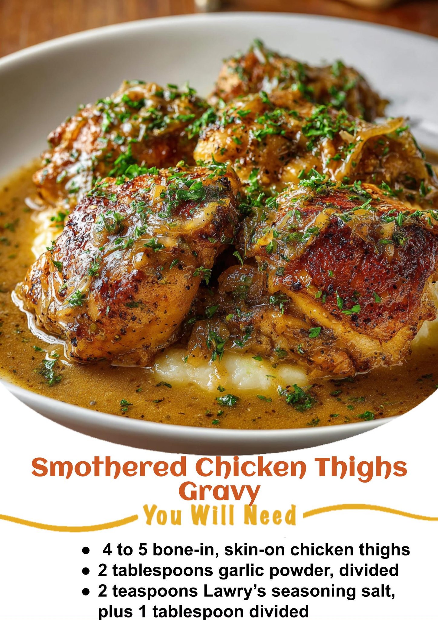 You can swap skinless thighs if you want to trim fat but retain some bone for flavor. Cajun seasoning or your favorite all purpose blend can sub in for Lawry’s. For a dairy free gravy use full fat coconut milk and olive oil instead of butter and cream.