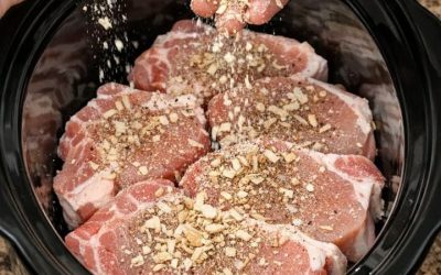 Sprinkle onion soup mix over pork chops, joined by 3 ingredients, into slow cooker for a savory feast that I crave this week after week