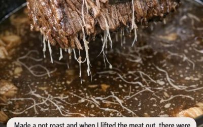 Made a pot roast and when I lifted the meat out, there were these weird stringy white threads clinging to it and floating in the liquid. They’re almost like tiny worms but not moving. Is my meat conta