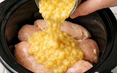 HomeDump cream style corn over chicken breasts, along with 2 ingredients, into slow cooker for a hearty meal that disappears…